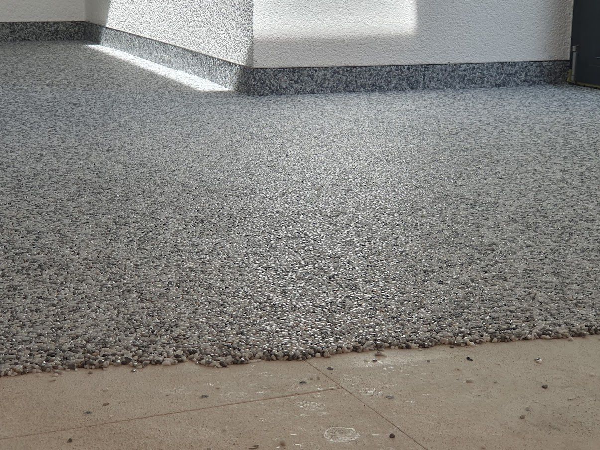Die mit Polyurethan-Harz verfestigte Oberfläche besteht aus entweder 2-4mm, oder 4-6mm Marmor-Steinchen. Die Schichtstärke bei unserem Belag beträgt 6mm bzw. 8 mm, je nach Körnung der Steine.
